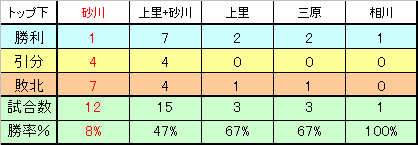 本日、職場の友人に、砂川がトップ下を単独でつとめた時の勝率が異常に低いとの話を聞いたので、改めて自分で統計を取ってみました。